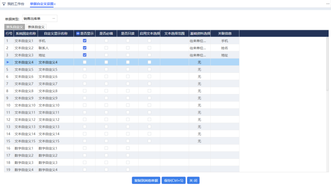 在銷售出庫單表頭啟用自定義字段,從“基礎資料選擇”中關聯往來單位,并指定需要調用的對應字段(如手機、聯系人、地址)。