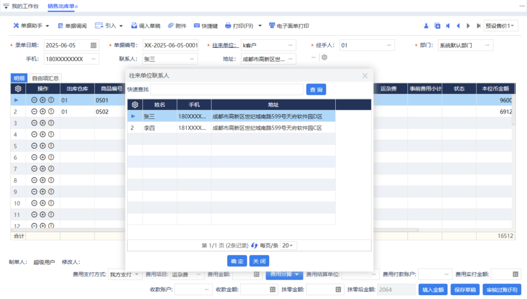 選擇客戶后,系統自動填充首個聯系人的信息(手機/聯系人/地址)。如需修改本次送貨信息,雙擊任意字段即可從聯系人列表重新選擇。