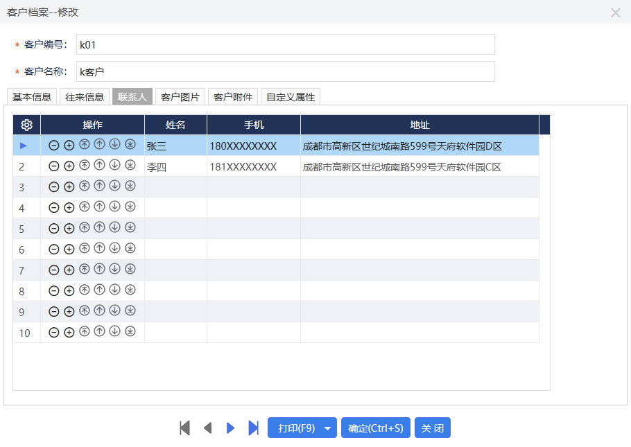 在客戶檔案的“聯系人”中,可添加多個聯系人,每個聯系人包含姓名、手機和地址。操作員可調整聯系人順序,系統將默認將排序第一的聯系人信息帶入單據。