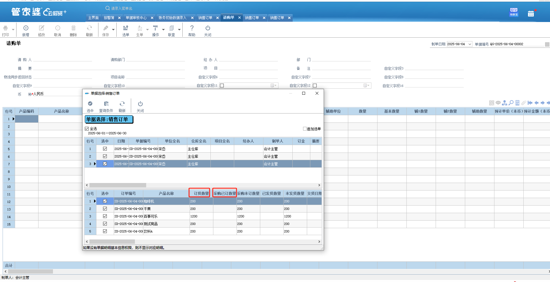 3. 多張銷售訂單可以合并或者有選擇生成請購單或者采購訂單,實現多銷售訂單合并采購。同時可在選單頁面看到銷售訂單商品哪些已經采購了,還有多少未生成采購,多少發貨了,多少未發。