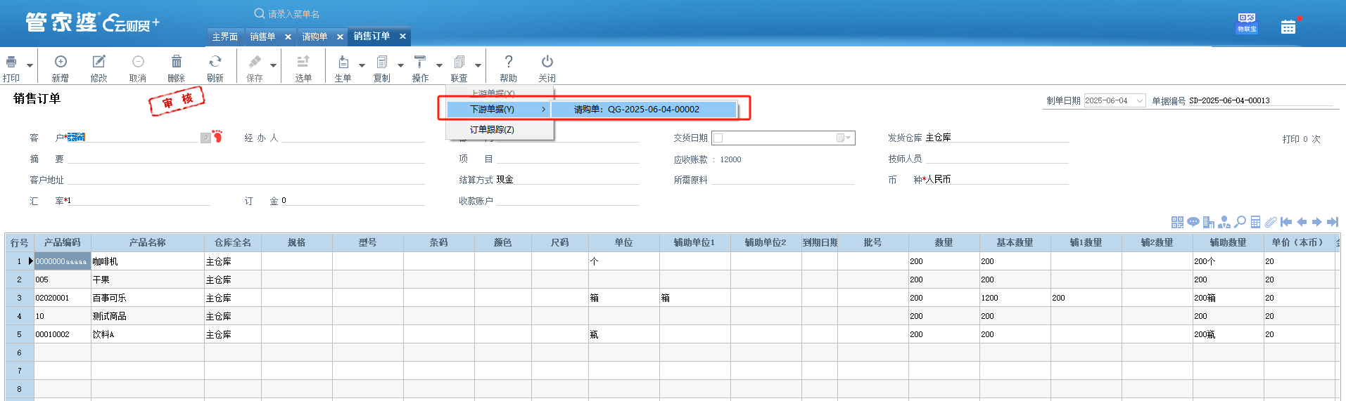 2. 銷售訂單可聯查生成請購及采購訂單情況 。